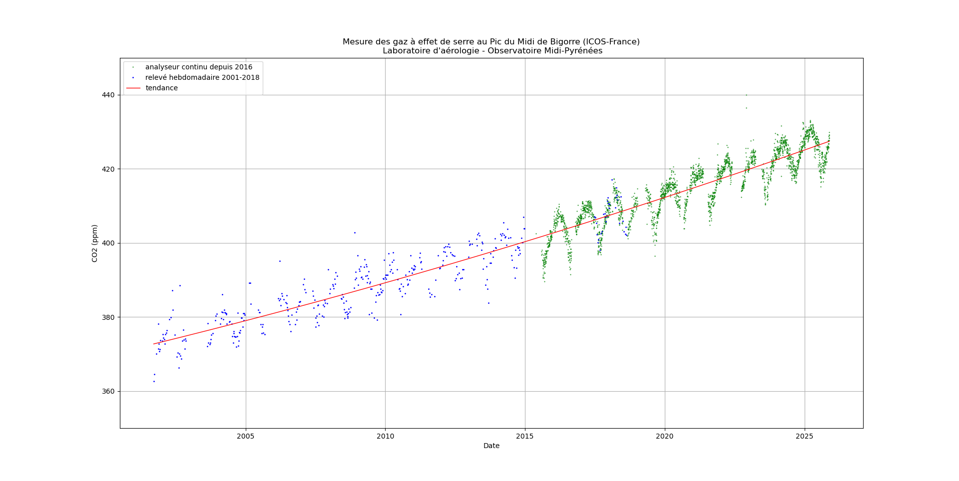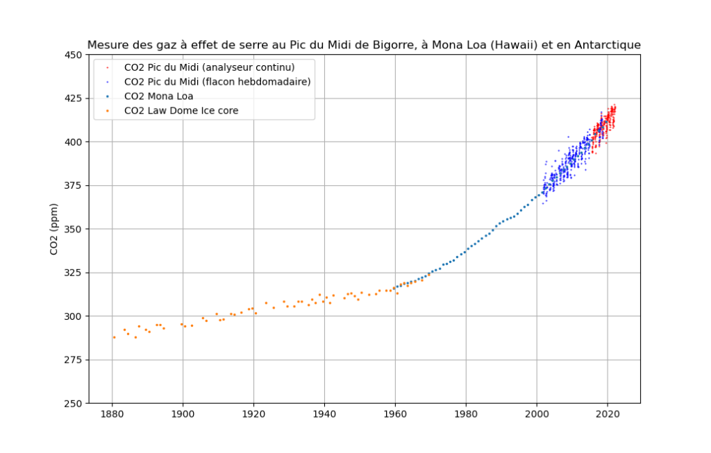 Sur ce relevé au pic du Midi, on voit bien l’augmentation récente du taux de CO2 et sa variation saisonnière : au printemps et en été, la végétation absorbe du CO2, faisant temporairement baisser le taux… Mais la tendance générale est clairement à la hausse (courbe rouge).