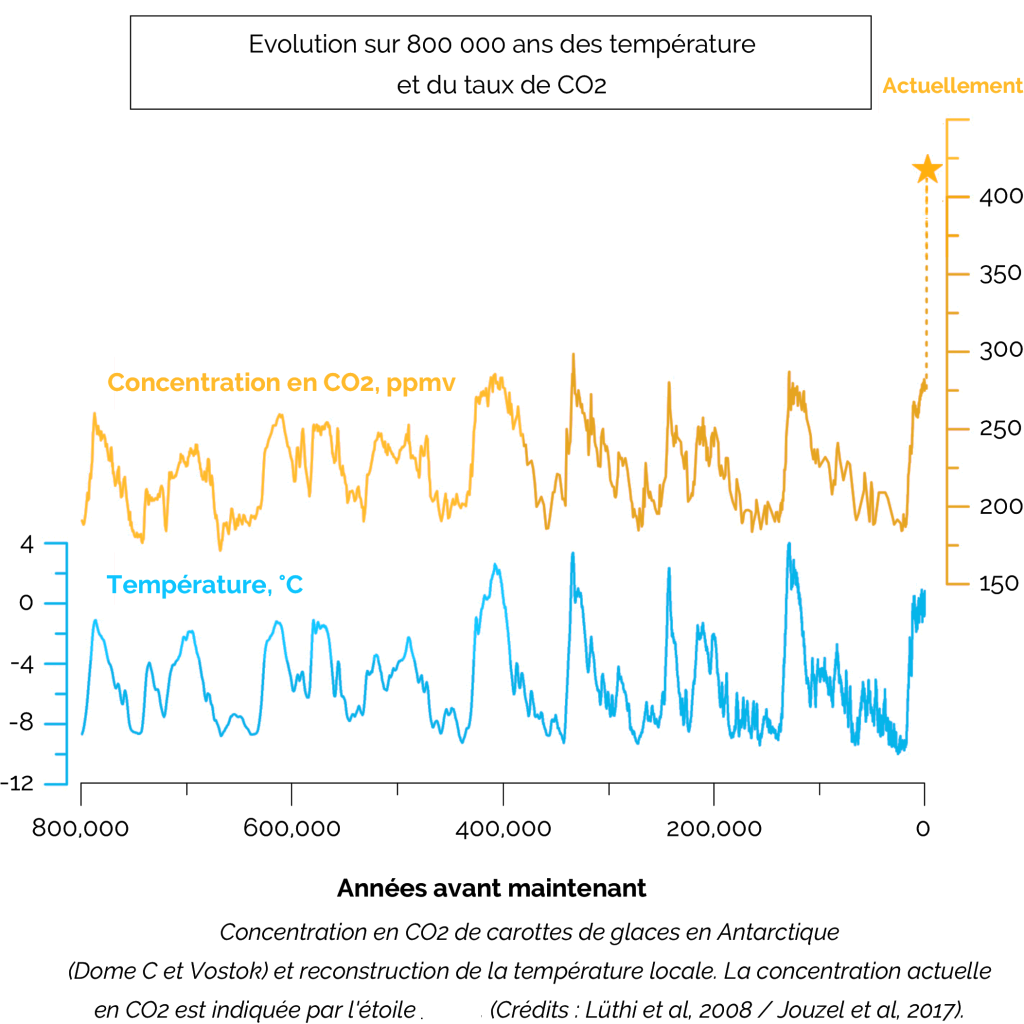 En réalisant des carottages dans les glaces en Antarctique, nous sommes capables de déduire la température et le taux de CO2 au cours des 800 000 dernières années.