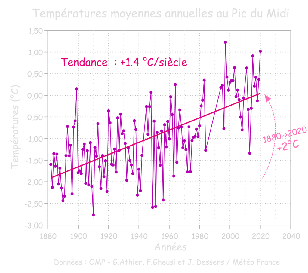 Depuis 1880, la température est relevée au pic du Midi et l’on constate une élévation de près de 1,4 °C par siècle de la température moyenne annuelle.