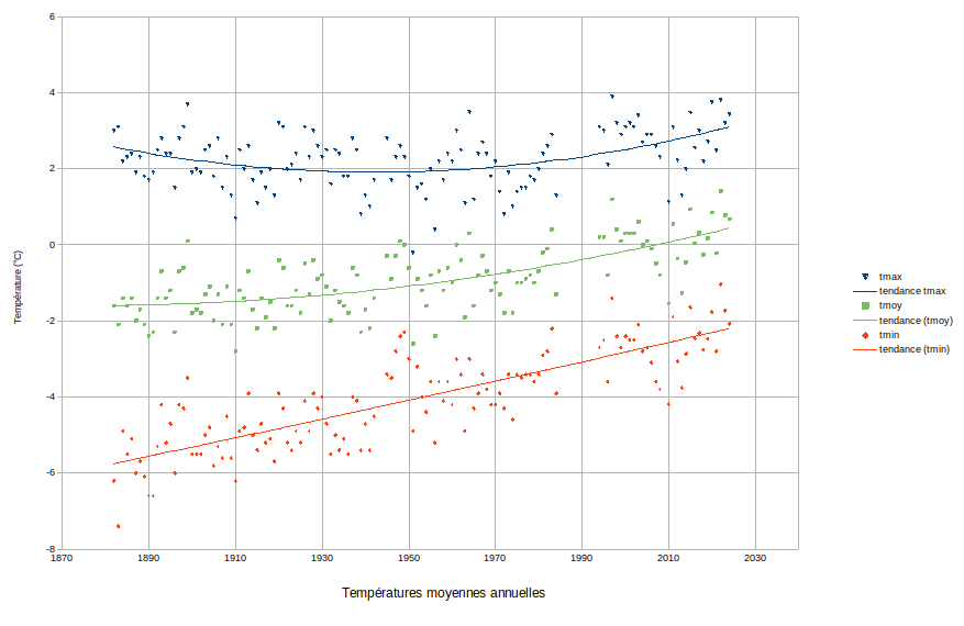 Dans le détail, on constate qu’au sommet du pic du Midi, les températures maximales (le jour) sont restées pratiquement stables tout au long du siècle dernier alors que les minimales (la nuit) étaient en forte augmentation. De nos jours les températures diurnes et nocturnes augmentent pareillement.